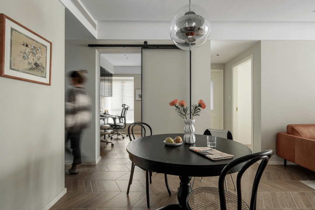 餐厅餐桌能够伸缩,可是设想气概采用了混搭模式,古朴典雅?